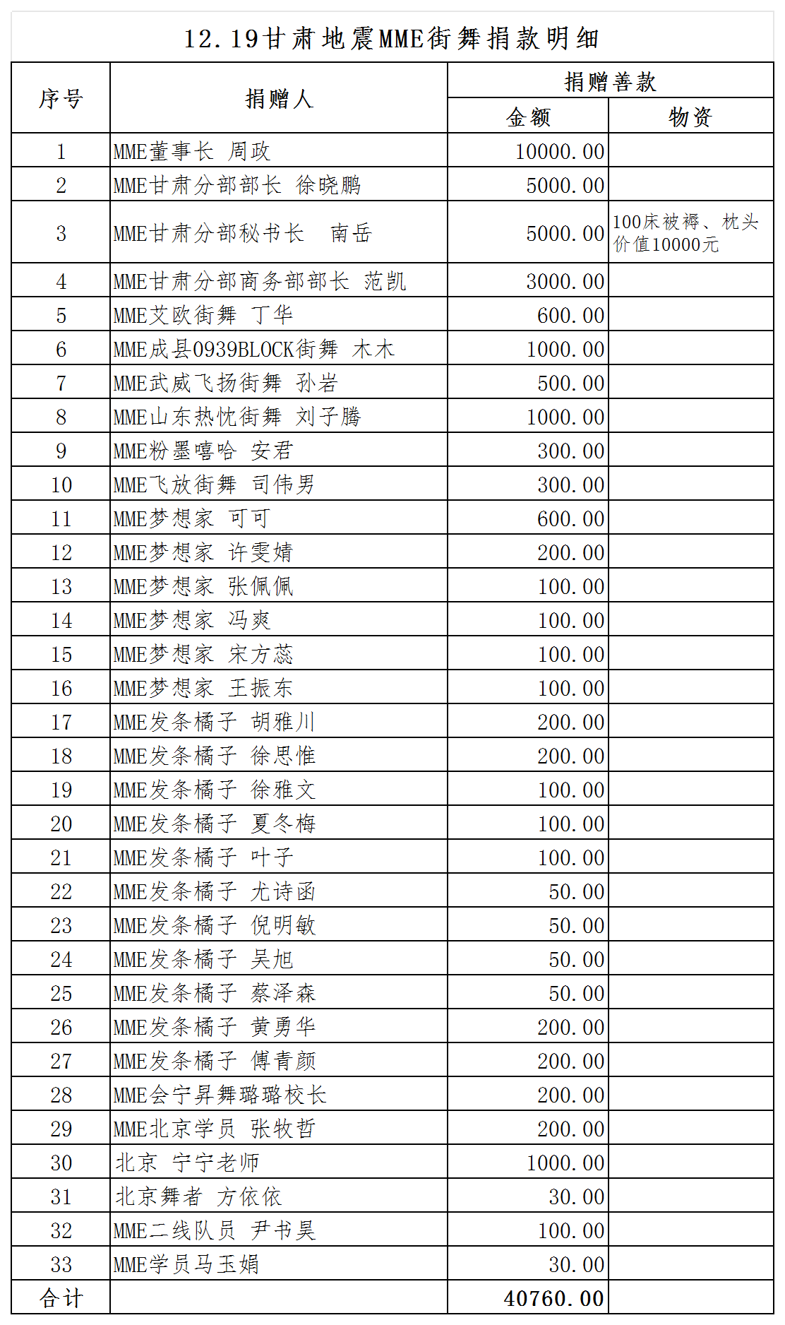 次日,MME街舞甘肃分部及时响应救援号召,经甘肃省文联及MME街舞总部批准后,面向全国MME街舞机构筹集捐款,甘肃分部迅速筹备棉被、枕头、方便面、饮用水、火腿肠(均为清真食品)等救灾物资,价值4万余元,连夜对接装车,于12月20日将所筹备物资送至灾区一线。