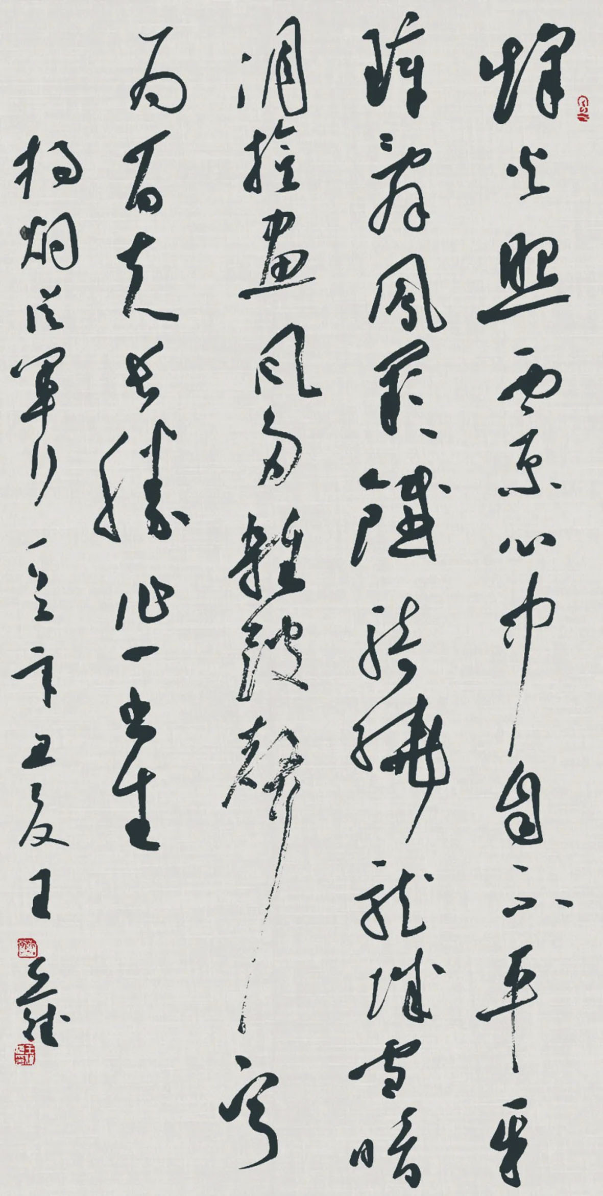 王亚斌虽多以行草示人,但对篆、隶、楷书皆曾沉潜,尤其隶书作品数次参加国展。他的隶书主要取法《乙瑛碑》《西狭颂》《礼器碑》《张迁碑》诸汉碑,对今人刘文华也有所借鉴,融入行草笔意稍作变态,字与字之间,横向密而纵向疏,顾盼有姿,大小、高低、方扁,形态各异,能于古质中见灵动,富于时代气息。临习正书,提升了其书法线条的质感,而在不同书体之间的游弋,让他熟悉了古今书法的流变,更深入的体会到了中国书法精神之所在。